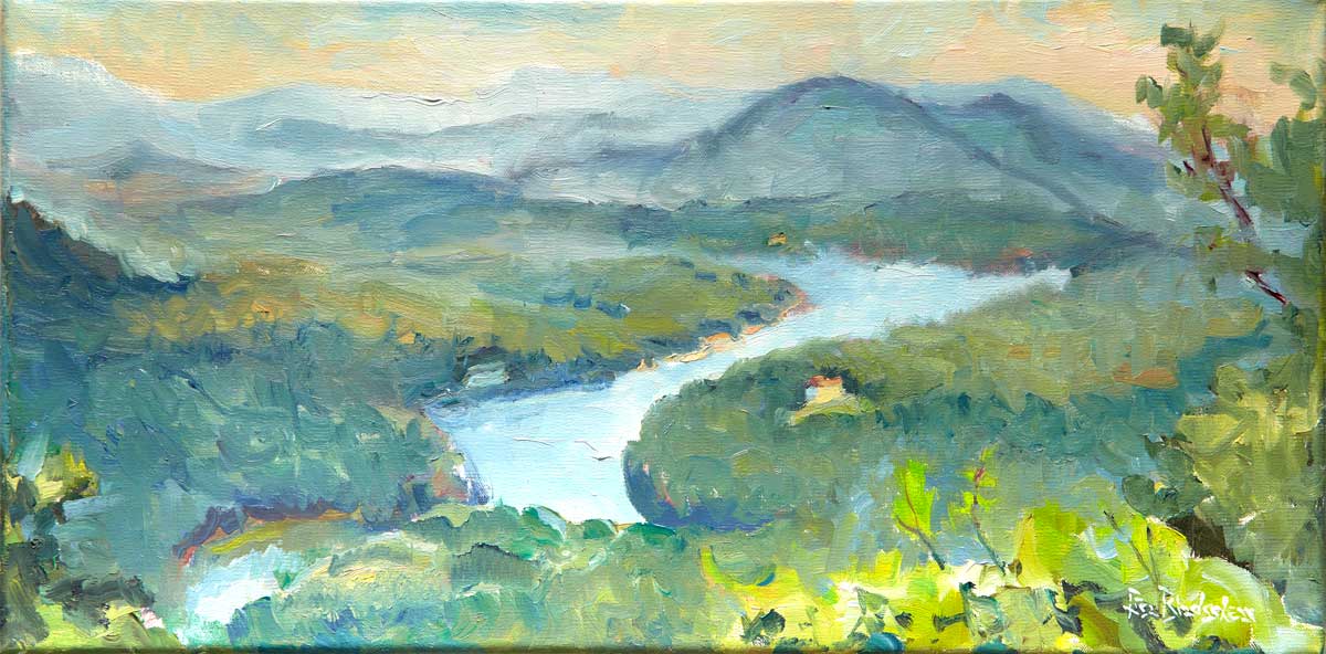 Panoramic view of Lake Lure from Chimney Rock Park, North Carolina just outside Asheville. In mellow blues and greens, this painting is gallery wrapped with painted sides for frameless presentation.